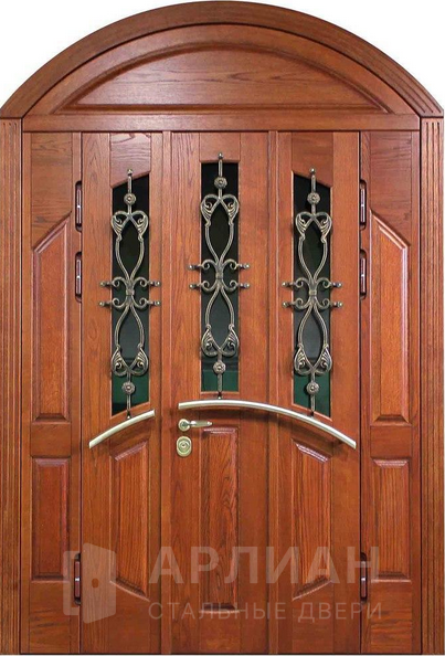 Входная арочная дверь с витражом и решеткой №419