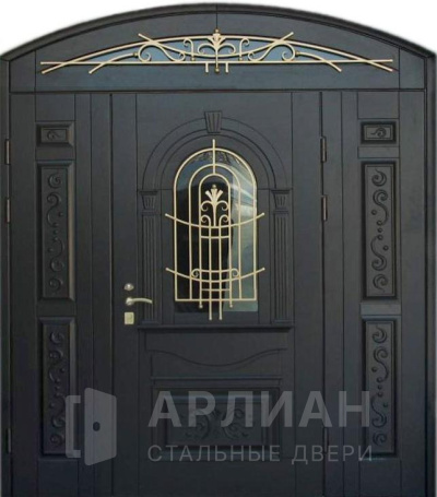 Двухстворчатая входная дверь со стеклом и ковкой №9